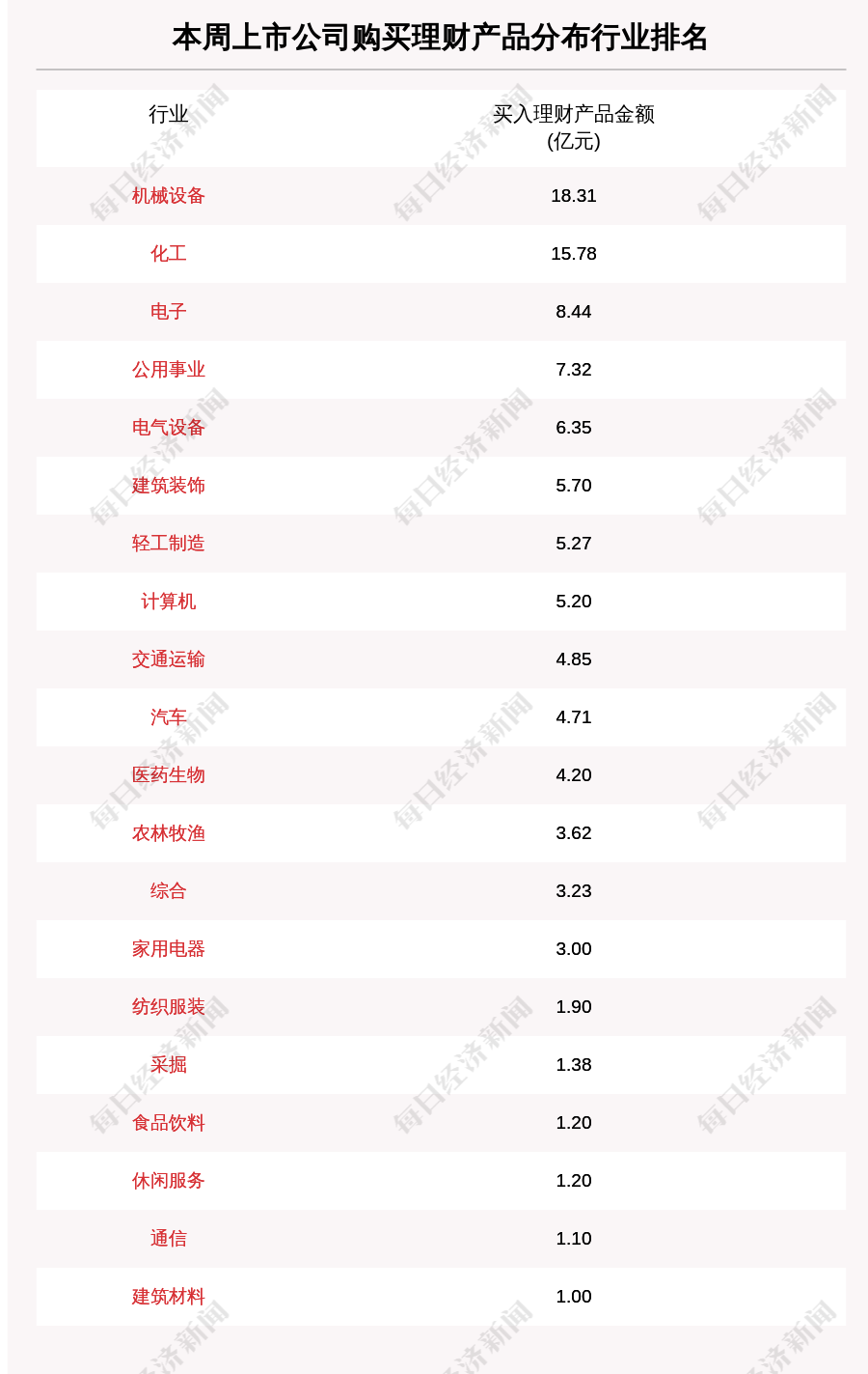 从上市公司所属行业上来看,本周买入理财产品金额排名前三的行业分别是机械设备、化工、电子。