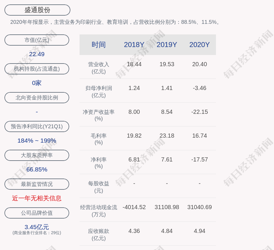 2020年年报显示,盛通股份的主营业务为印刷行业、教育培训,占营收比例分别为:88.5%、11.5%。
