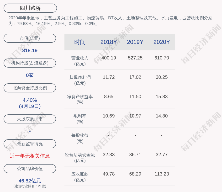 2020年年报显示,四川路桥的主营业务为工程施工、物流贸易、BT收入、土地整理及其他、水力发电,占营收比例分别为:79.63%、16.19%、2.9%、0.83%、0.3%。
