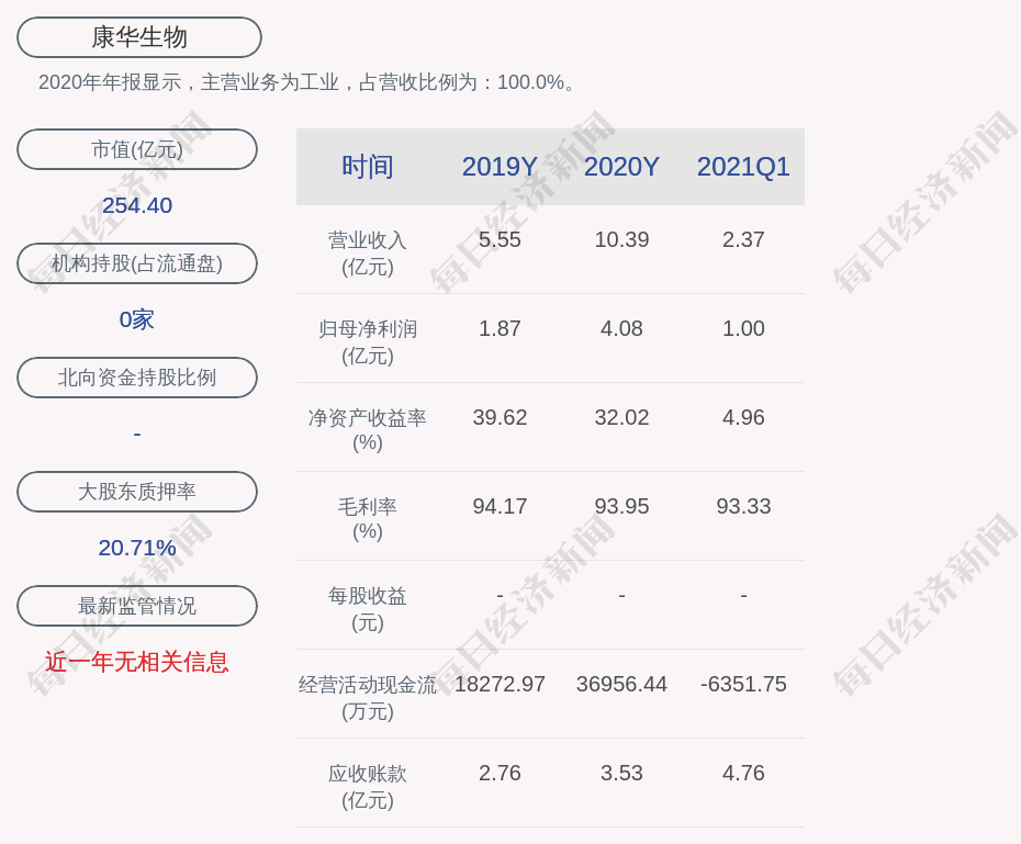 2020年年报显示,康华生物的主营业务为工业,占营收比例为:100.0%。