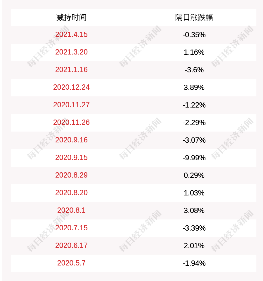 2. 振江股份上次发布减持公告是2021年04月15日,第二个交易日下跌0.35%,振江股份近一年共发布15次减持类公告。更多关键信息,请搜索“道达号”。
