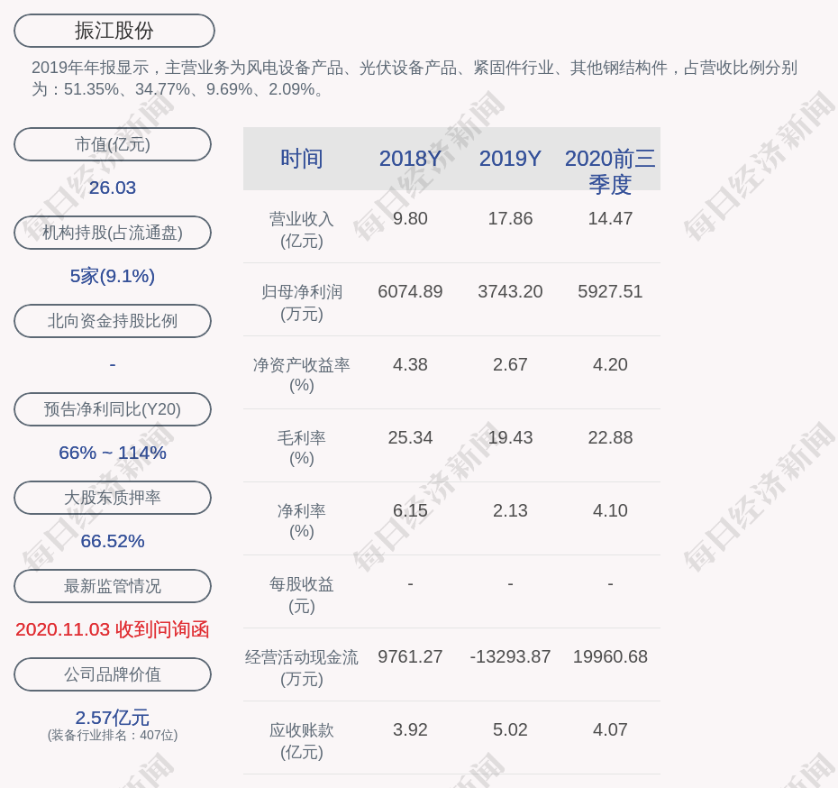 2019年年报显示,振江股份的主营业务为风电设备产品、光伏设备产品、紧固件行业、其他钢结构件,占营收比例分别为:51.35%、34.77%、9.69%、2.09%。