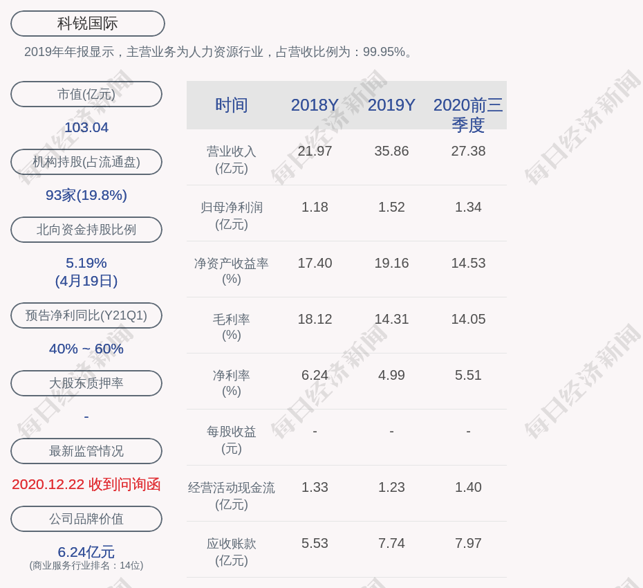 每经AI快讯,科锐国际(SZ 300662,收盘价:56.35元)4月20日晚间发布公告称,公司控股股东泰永康达于2021年4月19日质押181万股,占其所持股份比例为2.93%。