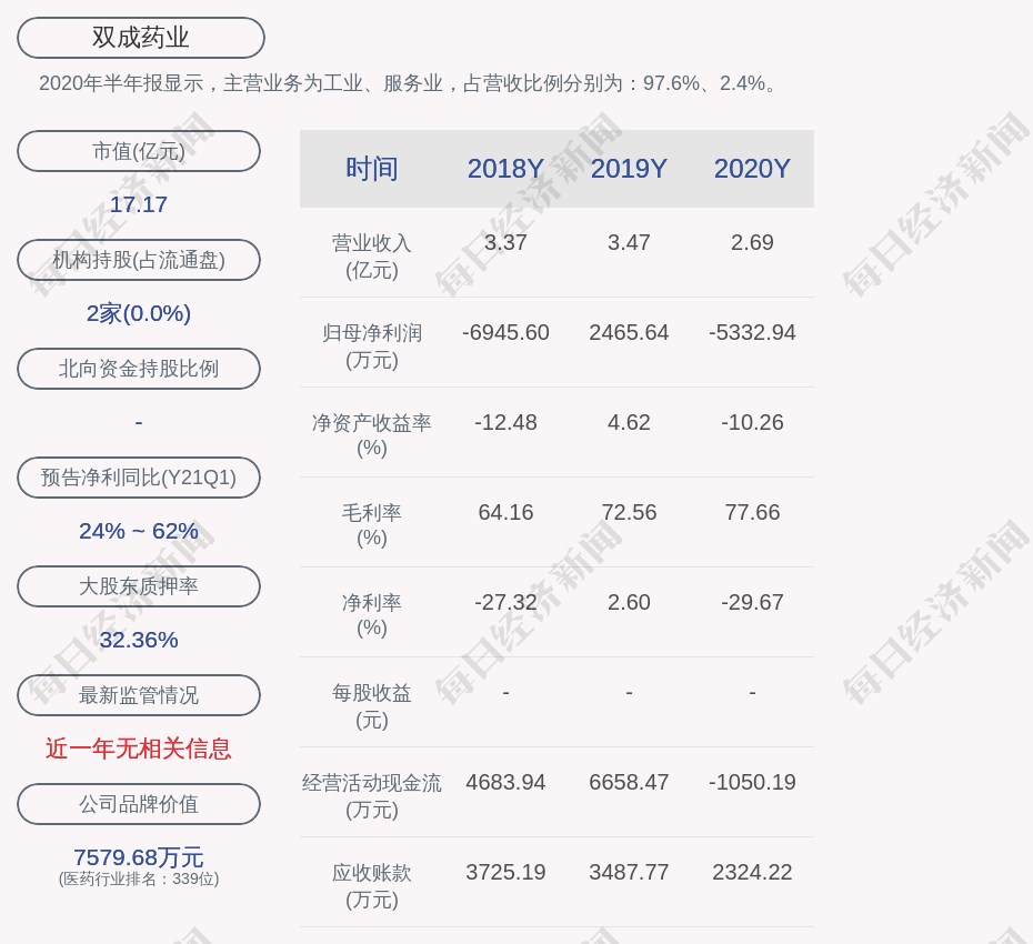 2020年半年报显示,双成药业的主营业务为工业、服务业,占营收比例分别为:97.6%、2.4%。