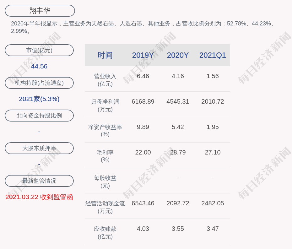 2020年半年报显示,翔丰华的主营业务为天然石墨、人造石墨、其他业务,占营收比例分别为:52.78%、44.23%、2.99%。