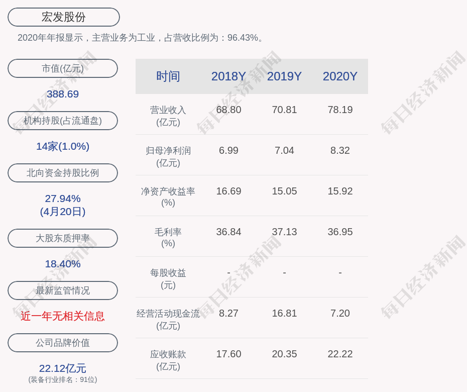2020年年报显示,宏发股份的主营业务为工业,占营收比例为:96.43%。