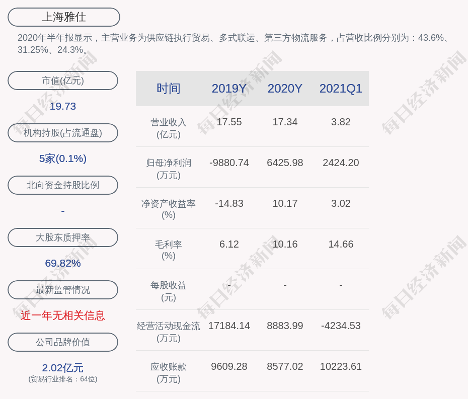 2020年半年报显示,上海雅仕的主营业务为供应链执行贸易、多式联运、第三方物流服务,占营收比例分别为:43.6%、31.25%、24.3%。