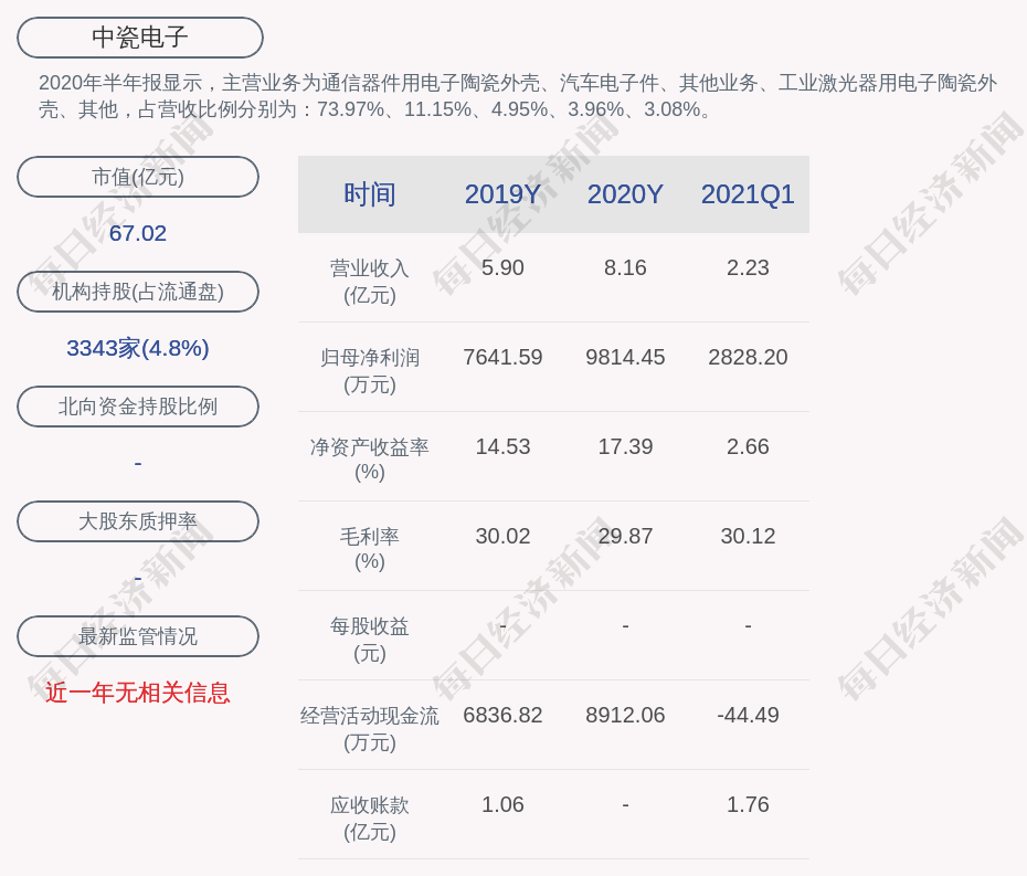 2020年半年报显示,中瓷电子的主营业务为通信器件用电子陶瓷外壳、汽车电子件、其他业务、工业激光器用电子陶瓷外壳、其他,占营收比例分别为:73.97%、11.15%、4.95%、3.96%、3.08%。