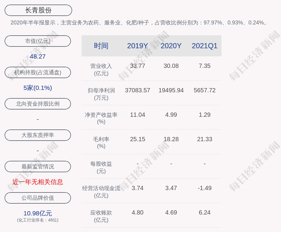 2020年半年报显示,长青股份的主营业务为农药、服务业、化肥/种子,占营收比例分别为:97.97%、0.93%、0.24%。