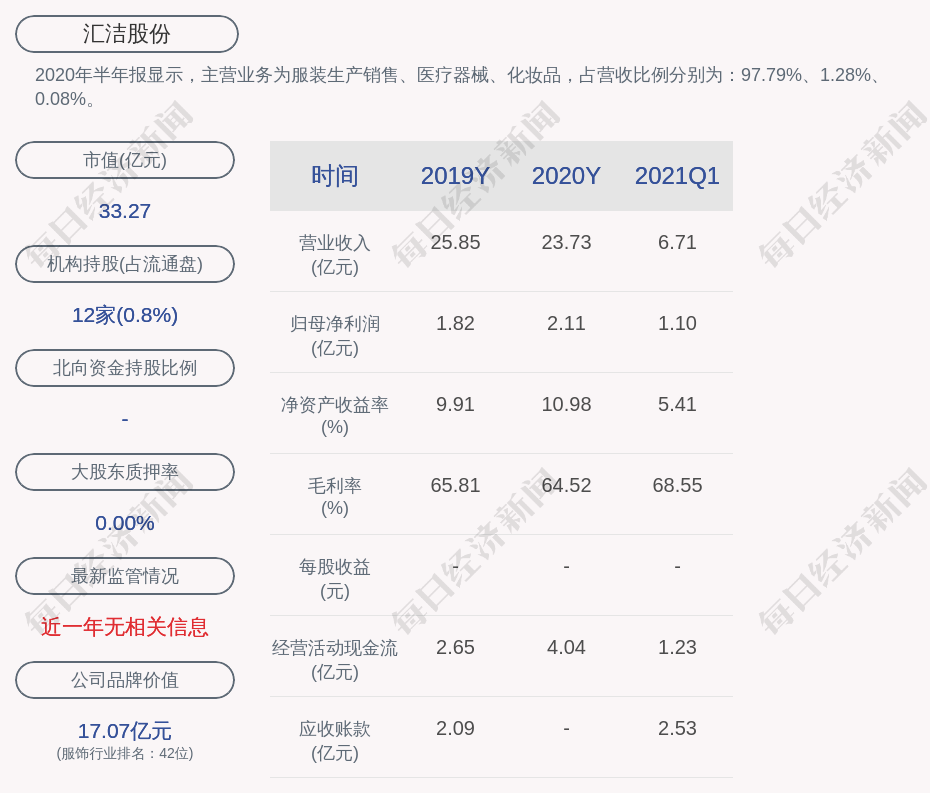 2020年半年报显示,汇洁股份的主营业务为服装生产销售、医疗器械、化妆品,占营收比例分别为:97.79%、1.28%、0.08%。