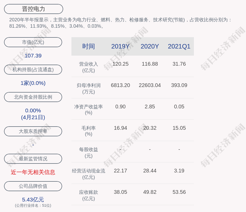 2020年半年报显示,晋控电力的主营业务为电力行业、燃料、热力、检修服务、技术研究(节能),占营收比例分别为:81.26%、11.93%、8.15%、3.04%、0.03%。