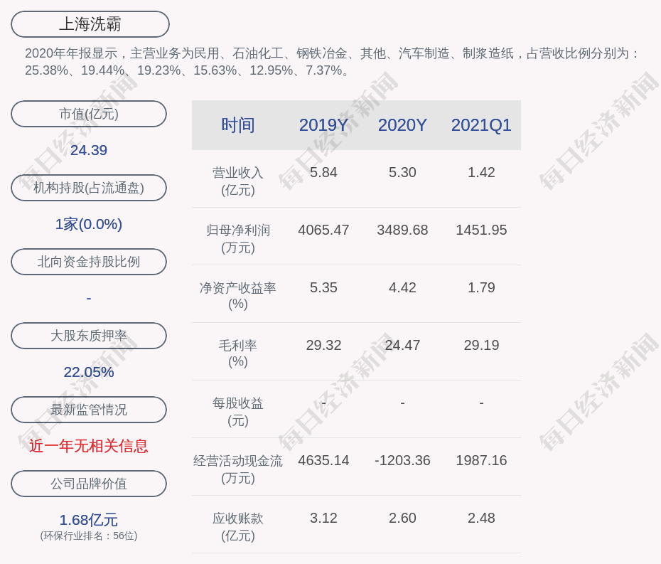2020年年报显示,上海洗霸的主营业务为民用、石油化工、钢铁冶金、其他、汽车制造、制浆造纸,占营收比例分别为:25.38%、19.44%、19.23%、15.63%、12.95%、7.37%。