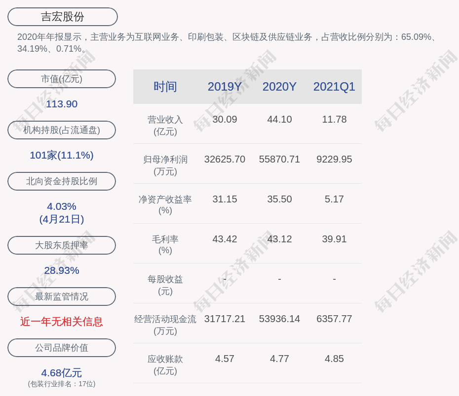 2020年年报显示,吉宏股份的主营业务为互联网业务、印刷包装、区块链及供应链业务,占营收比例分别为:65.09%、34.19%、0.71%。