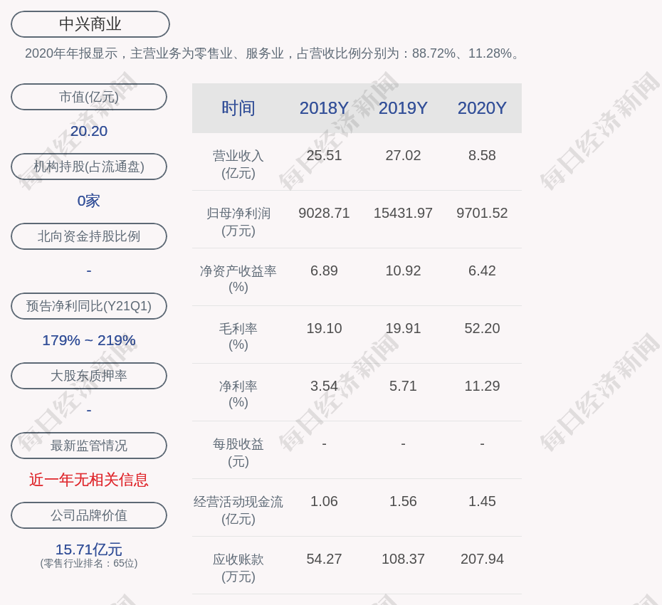 2020年年报显示,中兴商业的主营业务为零售业、服务业,占营收比例分别为:88.72%、11.28%。