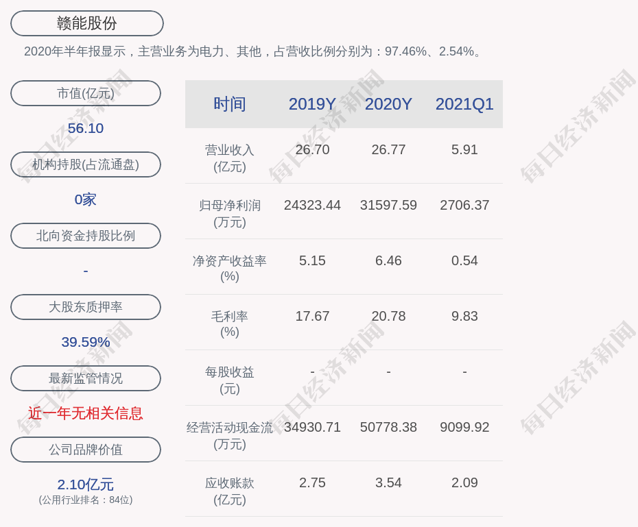 2020年半年报显示,赣能股份的主营业务为电力、其他,占营收比例分别为:97.46%、2.54%。