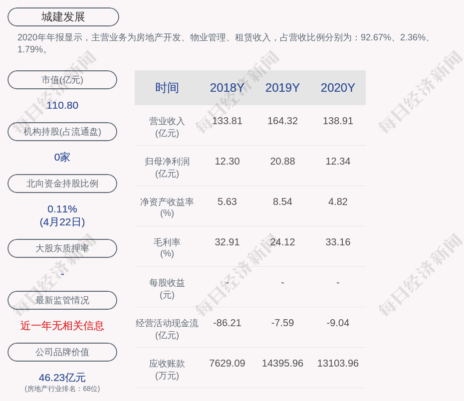 2020年年报显示,城建发展的主营业务为房地产开发、物业管理、租赁收入,占营收比例分别为:92.67%、2.36%、1.79%。