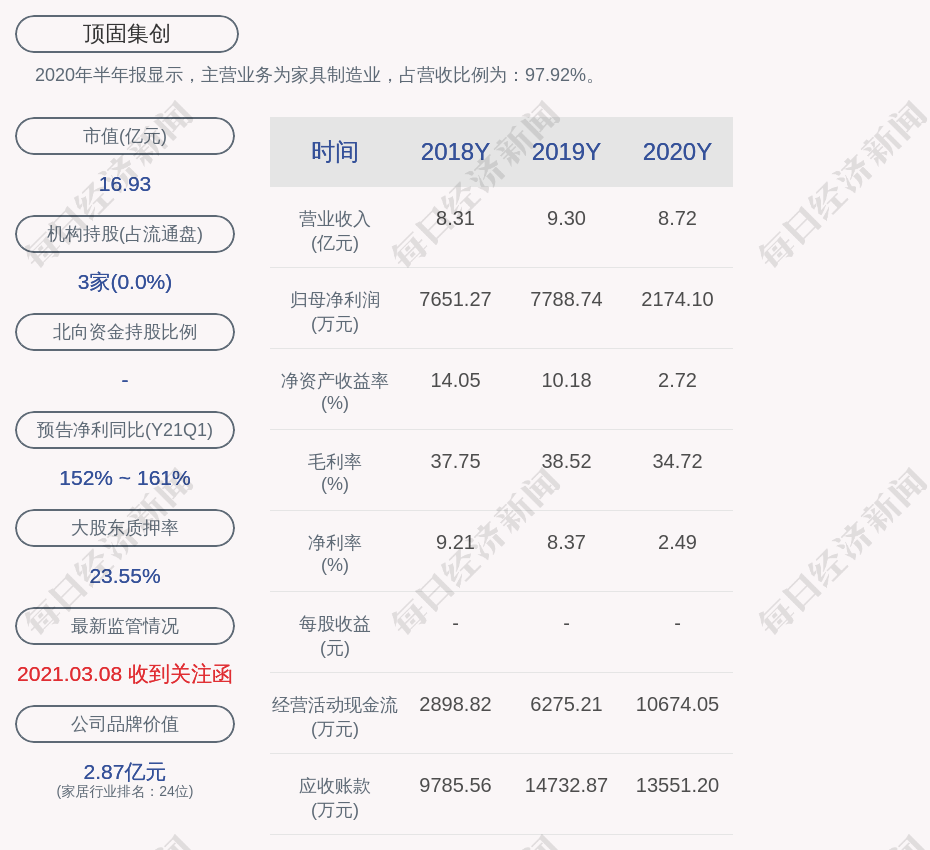 2020年半年报显示,顶固集创的主营业务为家具制造业,占营收比例为:97.92%。