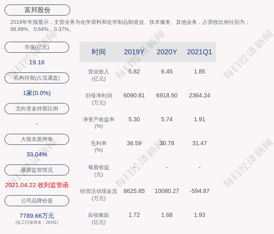 2019年年报显示,富邦股份的主营业务为化学原料和化学制品制造业、技术服务、其他业务,占营收比例分别为:98.99%、0.64%、0.37%。