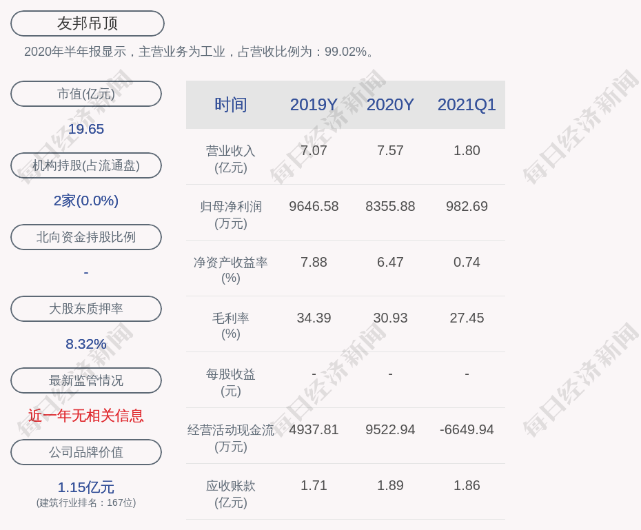 2020年半年报显示,友邦吊顶的主营业务为工业,占营收比例为:99.02%。
