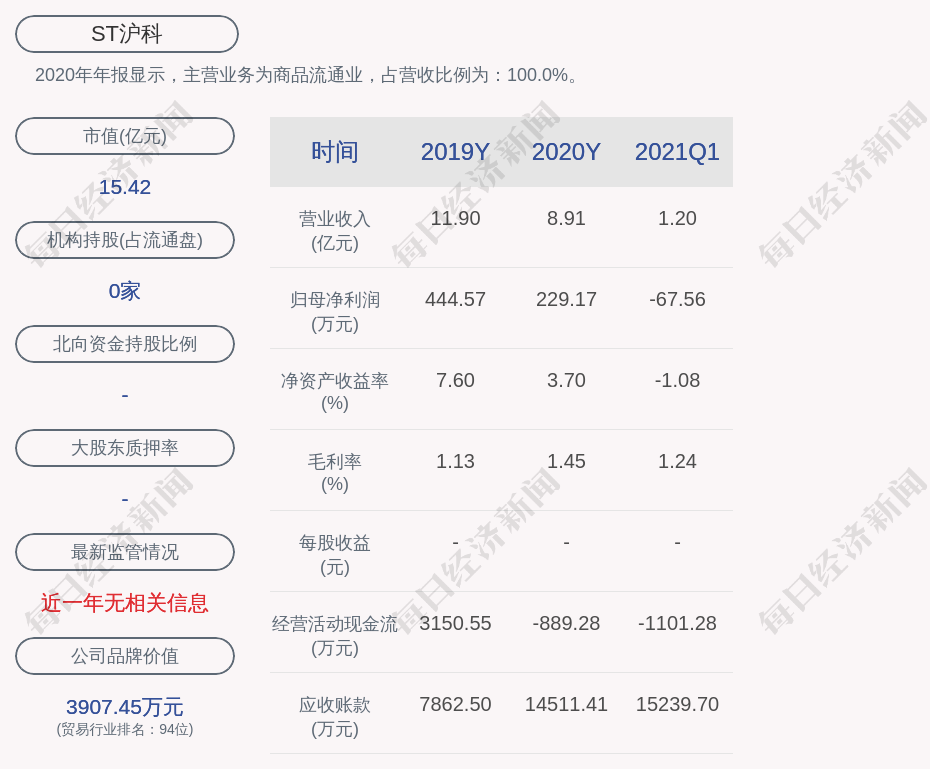 2020年年报显示,ST沪科的主营业务为商品流通业,占营收比例为:100.0%。