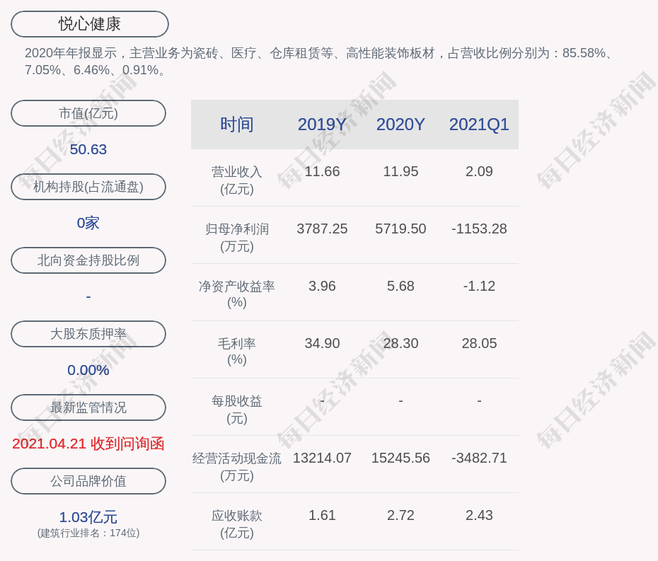 2020年年报显示,悦心健康的主营业务为瓷砖、医疗、仓库租赁等、高性能装饰板材,占营收比例分别为:85.58%、7.05%、6.46%、0.91%。
