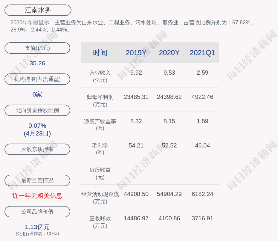 2020年年报显示,江南水务的主营业务为自来水业、工程业务、污水处理、服务业,占营收比例分别为:67.82%、26.9%、2.44%、0.44%。