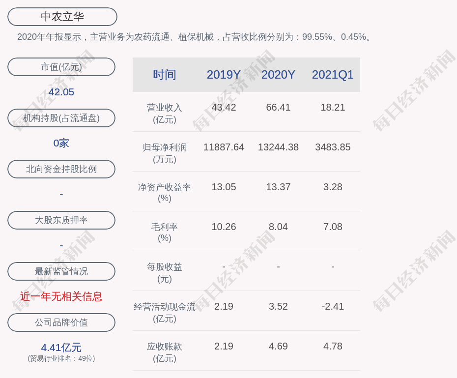 2020年年报显示,中农立华的主营业务为农药流通、植保机械,占营收比例分别为:99.55%、0.45%。