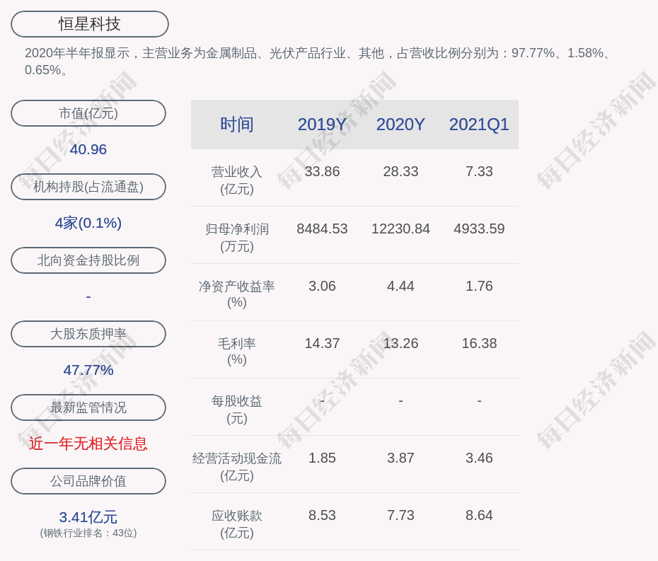 2020年半年报显示,恒星科技的主营业务为金属制品、光伏产品行业、其他,占营收比例分别为:97.77%、1.58%、0.65%。