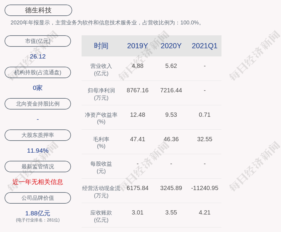 2020年年报显示,德生科技的主营业务为软件和信息技术服务业,占营收比例为:100.0%。