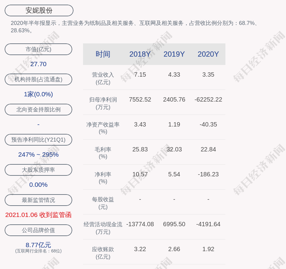 2020年半年报显示,安妮股份的主营业务为纸制品及相关服务、互联网及相关服务,占营收比例分别为:68.7%、28.63%。