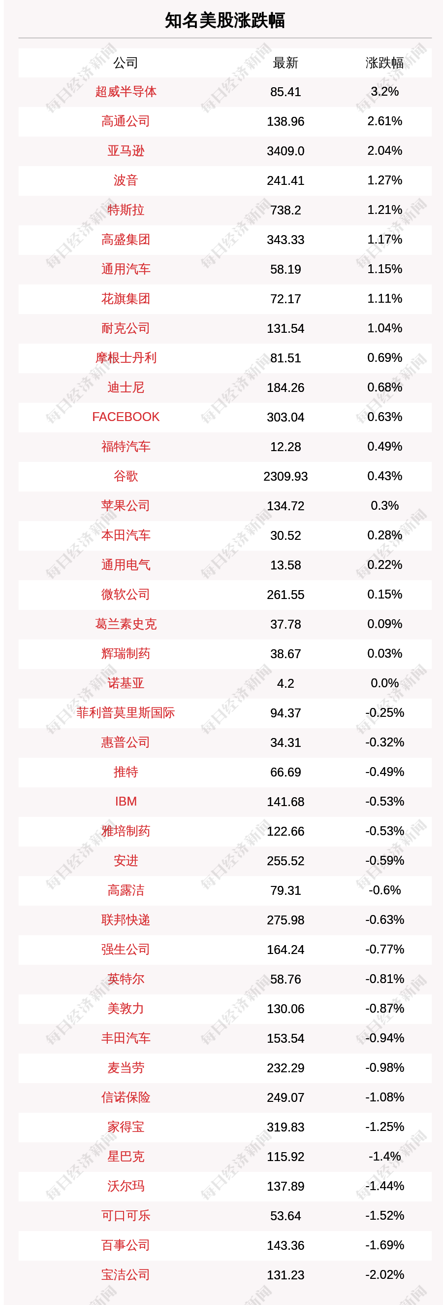 每经AI快讯:北京时间4月27日05:30,知名美股中超威半导体、高通公司、亚马逊、波音、特斯拉涨幅居前,收盘分别上涨3.2%、2.61%、2.04%、1.27%、1.21%。宝洁公司、百事公司、可口可乐、沃尔玛、星巴克跌幅居前,收盘分别下跌2.02%、1.69%、1.52%、1.44%、1.4%。