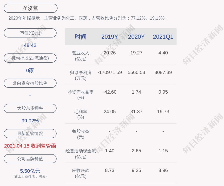 2020年年报显示,圣济堂的主营业务为化工、医药,占营收比例分别为:77.12%、19.13%。