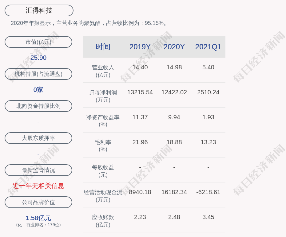 2020年年报显示,汇得科技的主营业务为聚氨酯,占营收比例为:95.15%。