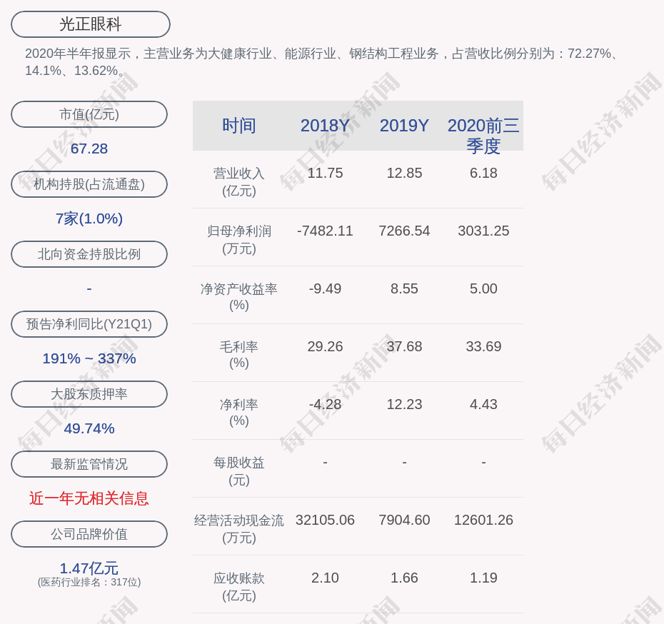 2020年半年报显示,光正眼科的主营业务为大健康行业、能源行业、钢结构工程业务,占营收比例分别为:72.27%、14.1%、13.62%。