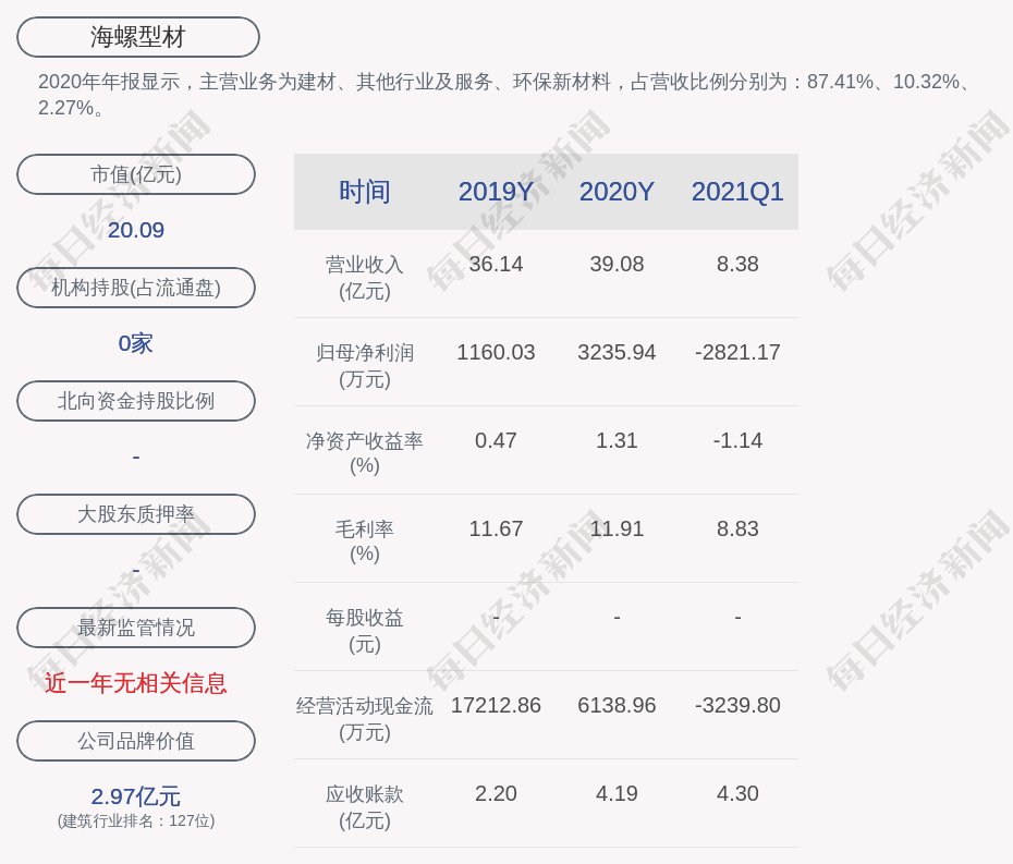 2020年年报显示,海螺型材的主营业务为建材、其他行业及服务、环保新材料,占营收比例分别为:87.41%、10.32%、2.27%。