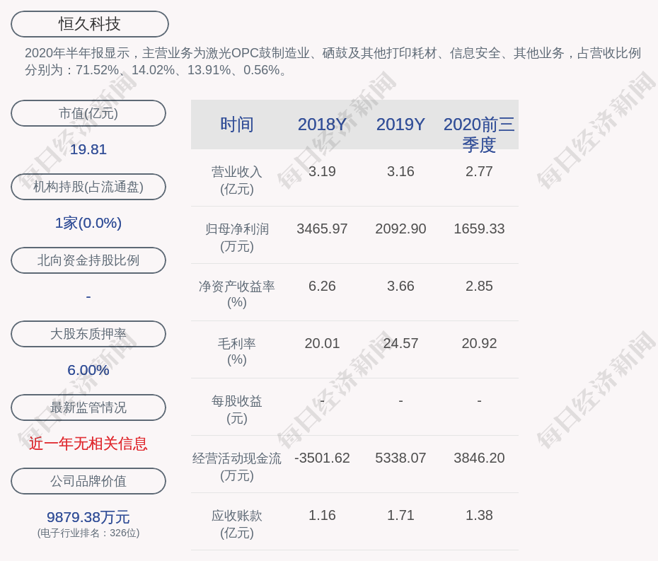 2020年半年报显示,恒久科技的主营业务为激光OPC鼓制造业、硒鼓及其他打印耗材、信息安全、其他业务,占营收比例分别为:71.52%、14.02%、13.91%、0.56%。