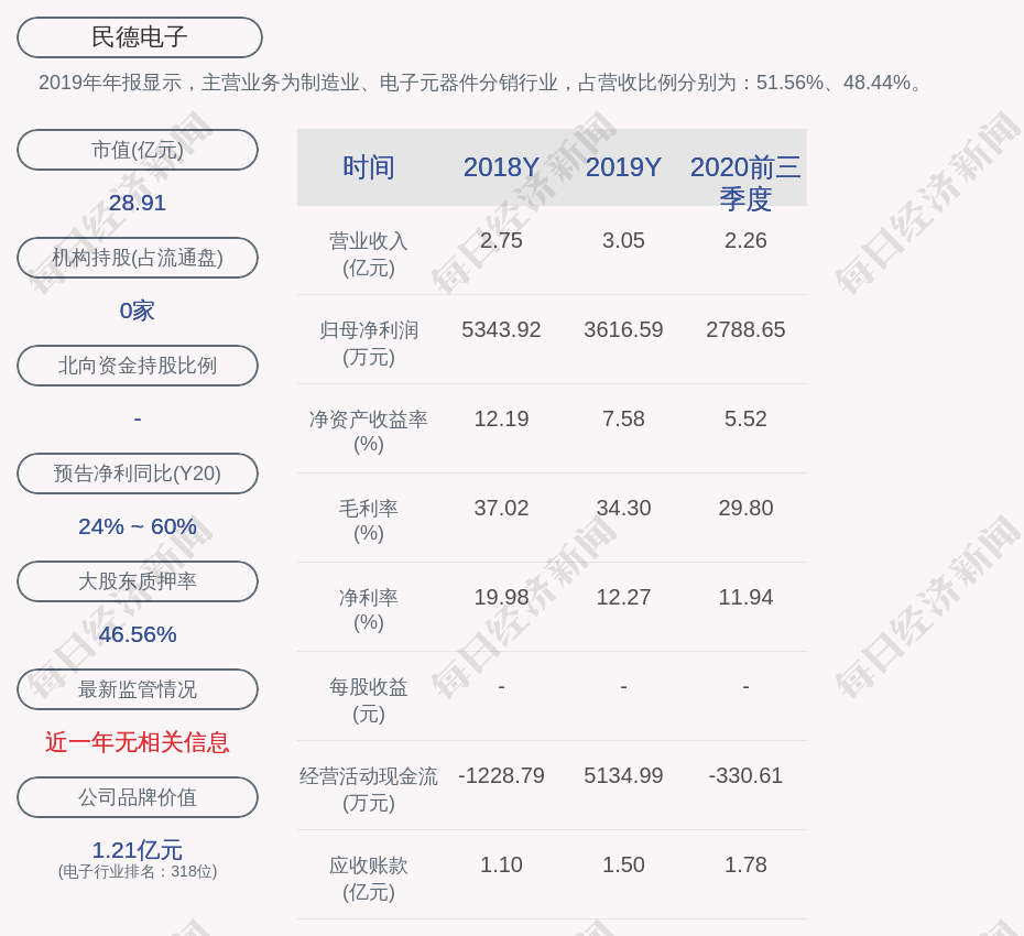 2019年年报显示,民德电子的主营业务为制造业、电子元器件分销行业,占营收比例分别为:51.56%、48.44%。