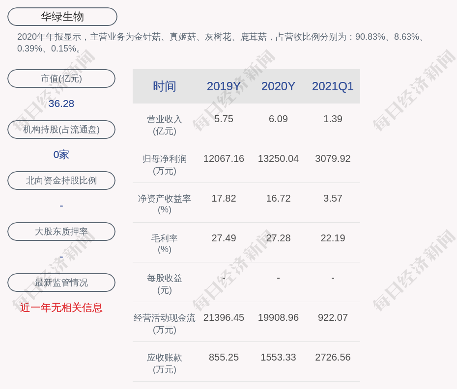 2020年年报显示,华绿生物的主营业务为金针菇、真姬菇、灰树花、鹿茸菇,占营收比例分别为:90.83%、8.63%、0.39%、0.15%。