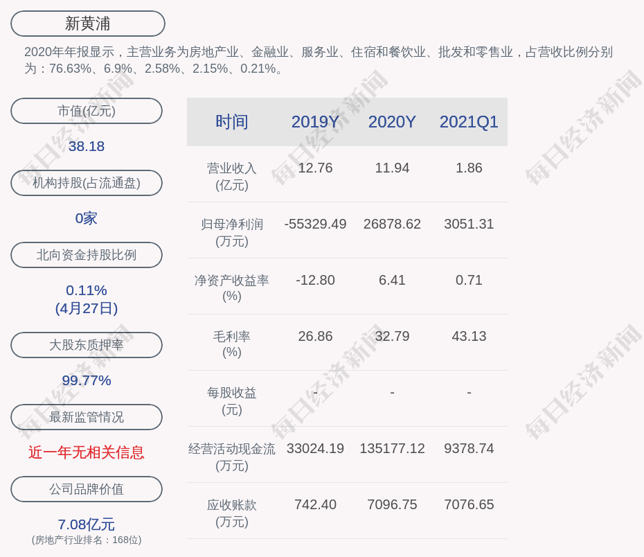 2020年年报显示,新黄浦的主营业务为房地产业、金融业、服务业、住宿和餐饮业、批发和零售业,占营收比例分别为:76.63%、6.9%、2.58%、2.15%、0.21%。