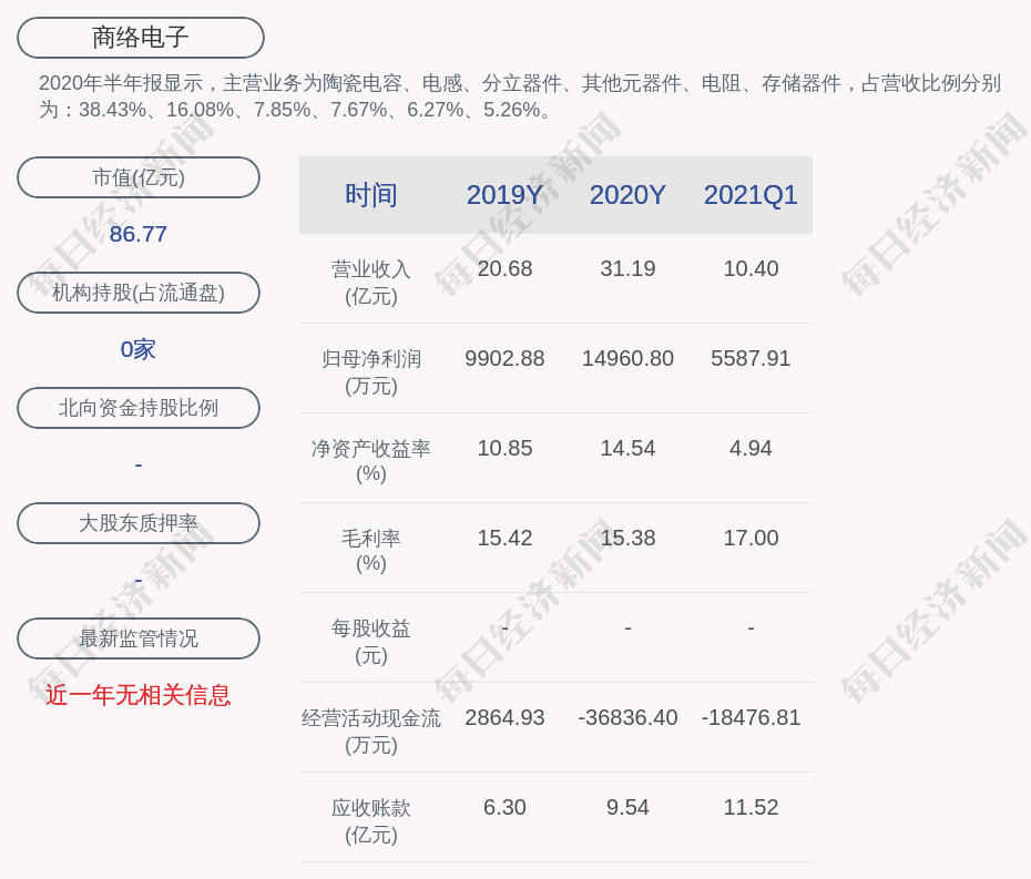 2020年半年报显示,商络电子的主营业务为陶瓷电容、电感、分立器件、其他元器件、电阻、存储器件,占营收比例分别为:38.43%、16.08%、7.85%、7.67%、6.27%、5.26%。
