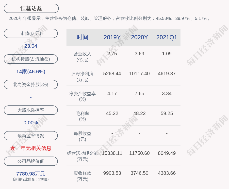 2020年年报显示,恒基达鑫的主营业务为仓储、装卸、管理服务,占营收比例分别为:45.58%、39.97%、5.17%。