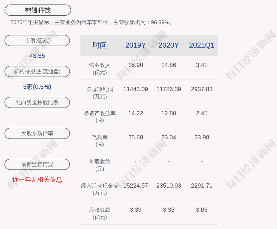 2020年年报显示,神通科技的主营业务为汽车零部件,占营收比例为:98.39%。