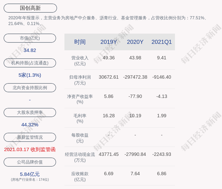 2020年年报显示,国创高新的主营业务为房地产中介服务、沥青行业、基金管理服务,占营收比例分别为:77.51%、21.64%、0.11%。