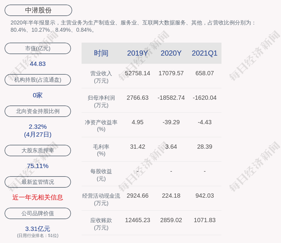 2020年半年报显示,中潜股份的主营业务为生产制造业、服务业、互联网大数据服务、其他,占营收比例分别为:80.4%、10.27%、8.49%、0.84%。