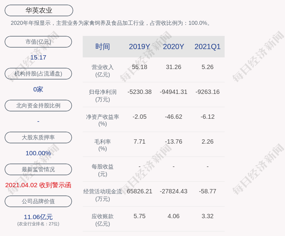 2020年年报显示,华英农业的主营业务为家禽饲养及食品加工行业,占营收比例为:100.0%。