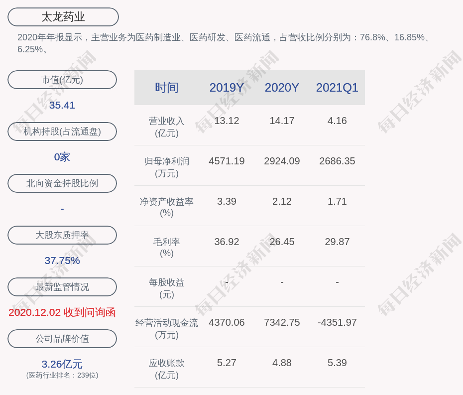 2020年年报显示,太龙药业的主营业务为医药制造业、医药研发、医药流通,占营收比例分别为:76.8%、16.85%、6.25%。