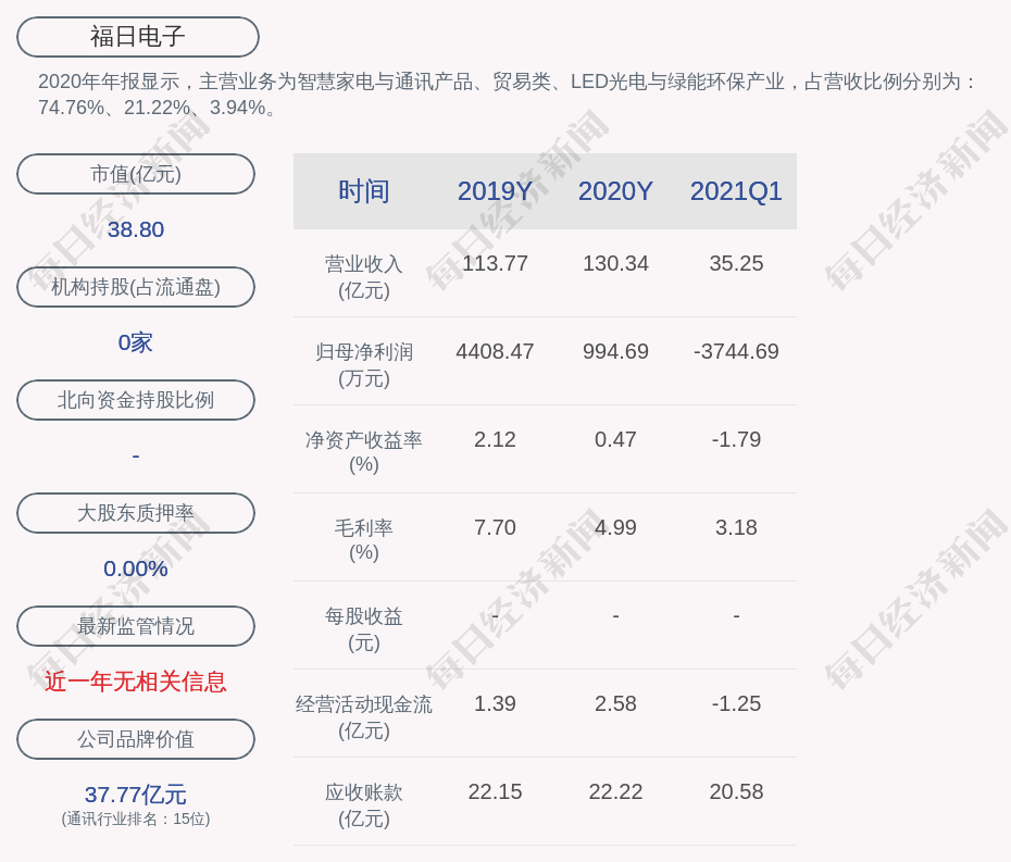 2020年年报显示,福日电子的主营业务为智慧家电与通讯产品、贸易类、LED光电与绿能环保产业,占营收比例分别为:74.76%、21.22%、3.94%。