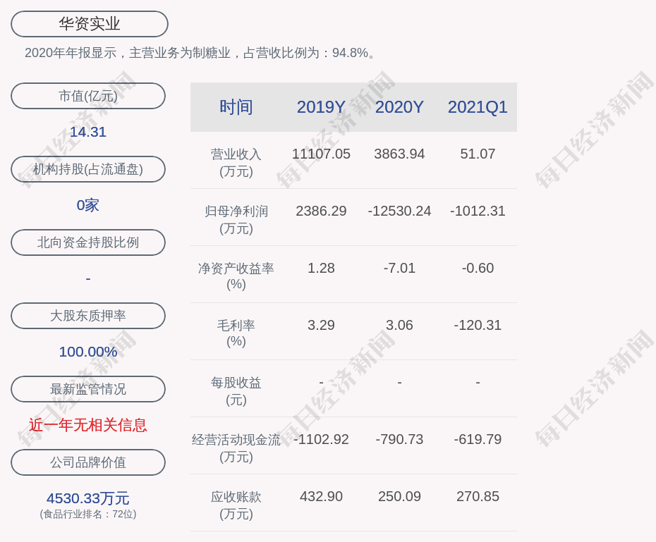 2020年年报显示,华资实业的主营业务为制糖业,占营收比例为:94.8%。