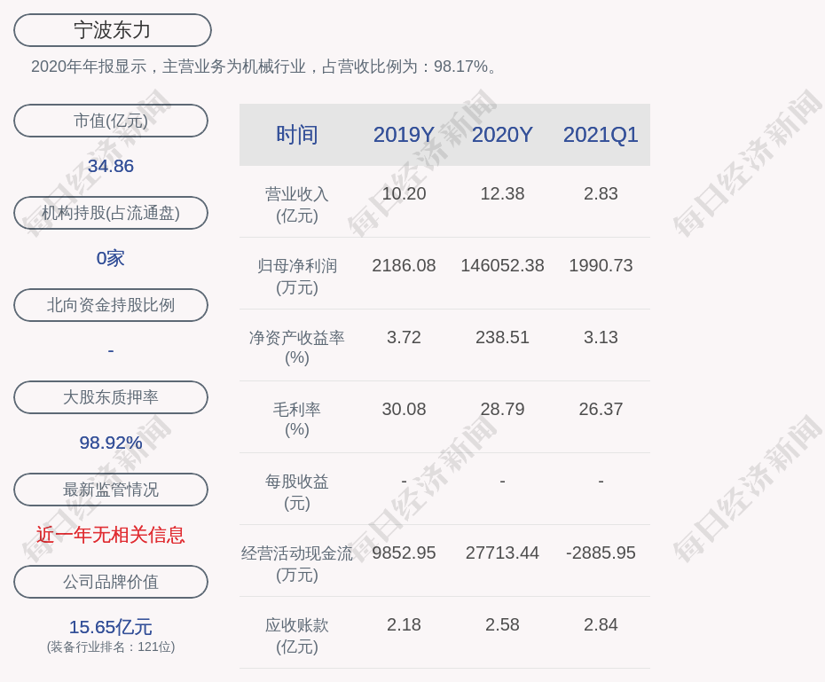 2020年年报显示,宁波东力的主营业务为机械行业,占营收比例为:98.17%。
