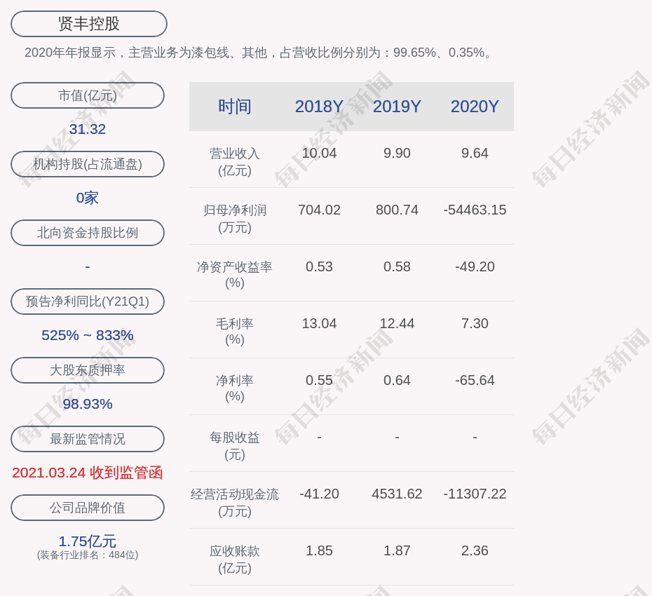 2020年年报显示,贤丰控股的主营业务为漆包线、其他,占营收比例分别为:99.65%、0.35%。